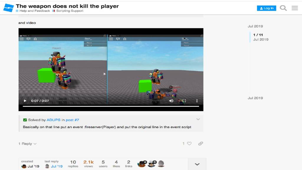 Robloxのフォーラムサイトでも話題を呼んだ「The weapon does not kill the player」の投稿は、Roblox開発者がゲーム開発を始めると、最初に気がつく問題ではないのでしょうか。今回は、リモートイベントの仕組みを考える良い機会です。難しいようにみえても、意外と簡単だったということもありますので、コードがうまく走らないで悩んでいるのは自分だけではないと、仲間をみつけた気分で読み進めて下さい。また、このフォーラムサイトは、経験豊富なRobloxのプログラマーが親身になって問題を解決に導きます。もしご興味がある方は覗いて見て下さい。何かを得れる可能性が高いと思います。