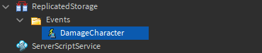 まず、ReplicateStorageにEventsという名前のフォルダを作成します。次に、リモートイベントをEventsフォルダに作成し、DamageCharacterという名前で保存します。