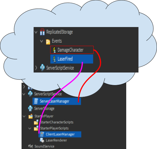 今日は、クライアントからサーバーへの通信について学びます。 クライアントが他のクライアントに直接ダメージを与えることはできないので、プレイヤーが銃に撃たれたときにダメージを与える責任はサーバーにあります。クライアントはリモートイベントを作成して、キャラクターが銃に撃たれたことをサーバーに伝えることができます。これらのイベントは、クライアントとサーバーの両方から見えるように、複製されたストレージReplicateStorageに保存する必要があります。